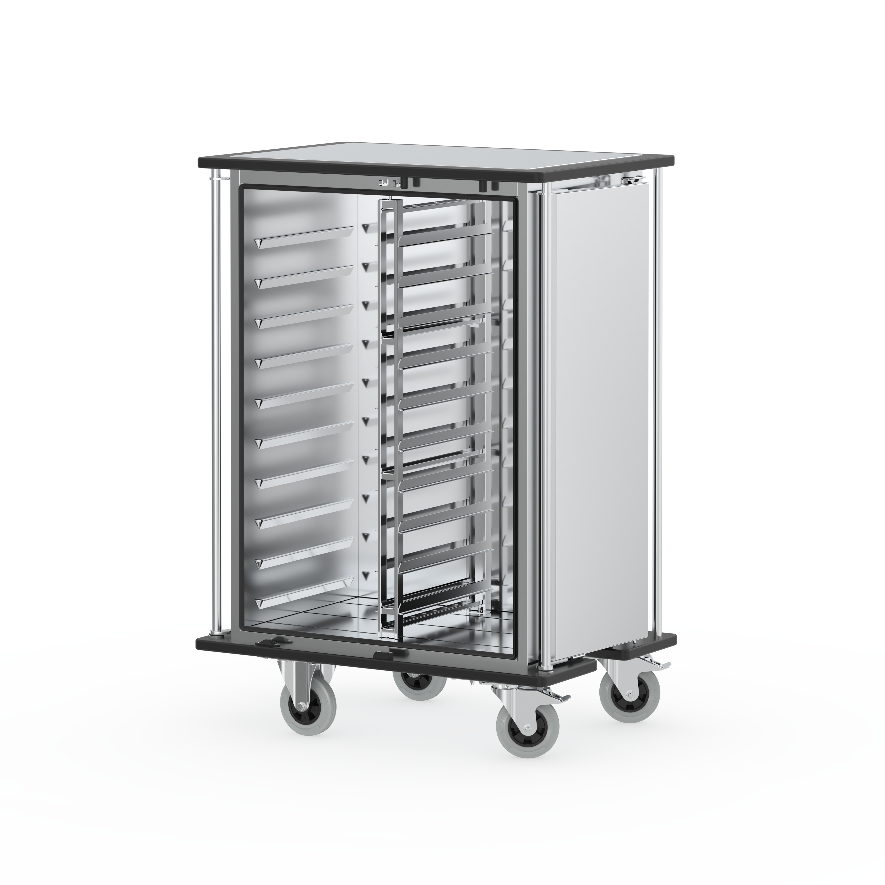 Allseitig geschlossener, doppelwandig isolierter Transportwagen aus Edelstahl. Bauweise und Materialauswahl sind für den jahrelangen, täglichen Einsatz mit hohen mechanischen Beanspruchungen ausgelegt. Glatte Oberflächen außen und innen ermöglichen eine hygienische Reinigung des Wagens. Umlaufende Stoßleisten aus Kunststoff-Vollmaterial an Chassis und Dach schützen den Wagen effektiv vor Beschädigungen. Qualitätsrollen gemäß DIN und vier Schiebestangen ermöglichen ein leichtes Handling des Wagens. Gut abgedichtete Türen und eine vollständige Isolation des Korpus ermöglichen eine gesicherte Einhaltung der Kühlkette und der Temperaturanforderungen nach HACCP. Mit einer Vielzahl an Ausstattungsoptionen lässt sich der Transportwagen an individuelle Bedürfnisse anpassen.